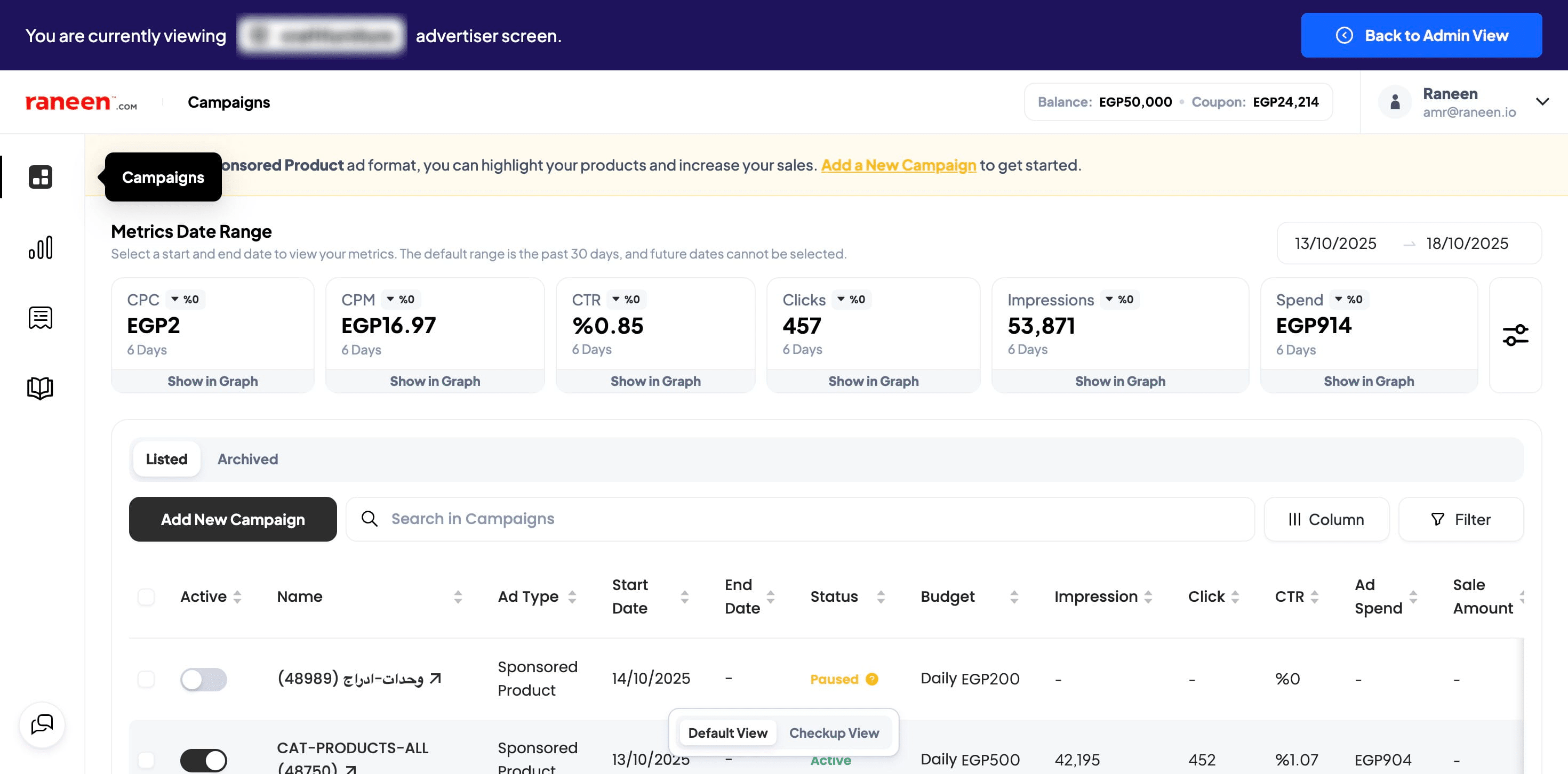 You can click "show in graph" to see CPC performance, CPM performance, CTR performance, number of clicks (customers who visited your product), how many times your products were visible at Raneen, and advertising spend.